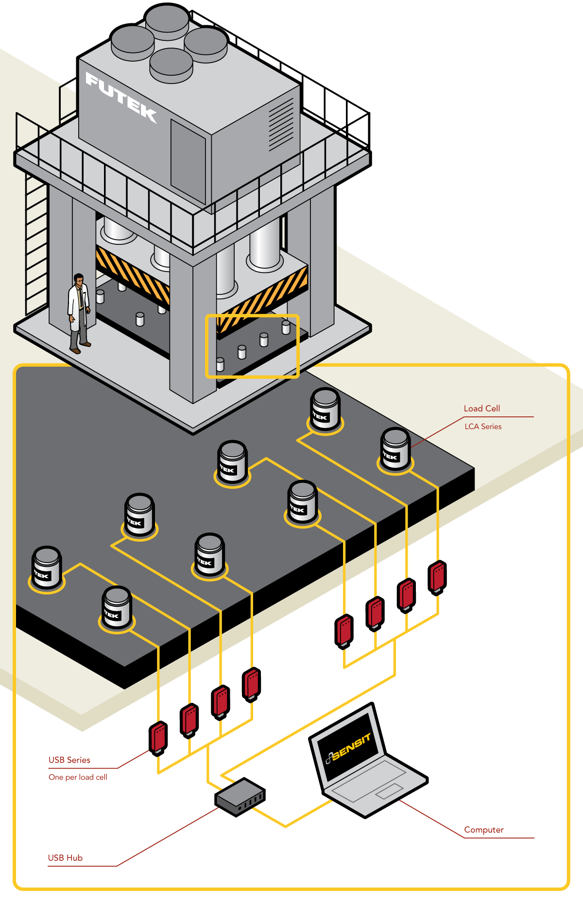 3、當(dāng)壓力機(jī)向LCA傳感器施壓時(shí),傳感器的數(shù)據(jù)通過FUTEK的USB采集模塊傳輸?shù)诫娔X上,SENSIT軟件實(shí)時(shí)顯示傳感器受到的壓制力,監(jiān)測壓力機(jī)的輸出力是否合格。