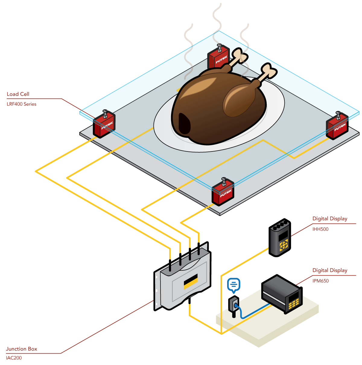 四個(gè)低剖面測力傳感器(LRF系列),搭配FUTEK的IAC200加法接線盒,以及IHH500手持式儀表或IPM650面板安裝式顯示儀表。