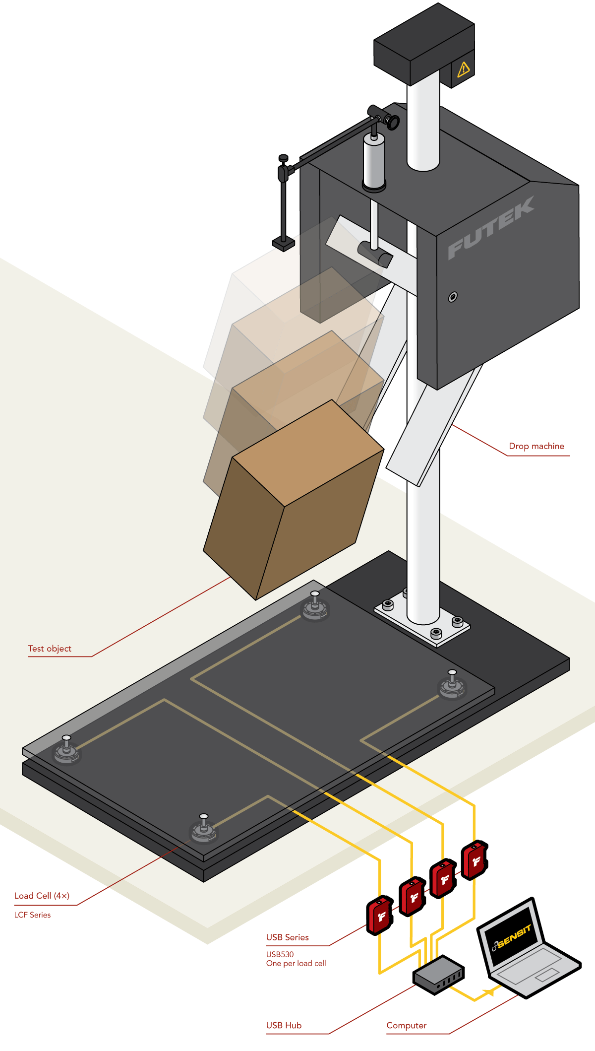 包裝袋跌落測(cè)試是測(cè)試不同包裝設(shè)計(jì)可行性的一種新穎的方式,通過測(cè)試來保證包裝的產(chǎn)品安全地到達(dá)目的地。為了實(shí)現(xiàn)這一點(diǎn),跌落測(cè)試機(jī)將包裝袋從不同高度跌落至平臺(tái)上,測(cè)力傳感器安裝在平臺(tái)的下方。傳感器輸出包裝袋沖擊平臺(tái)的力。此外,平臺(tái)可以移動(dòng),這使得我們可以搭建不同的平臺(tái)來測(cè)試不同的跌落情景,比如樓梯跌落。