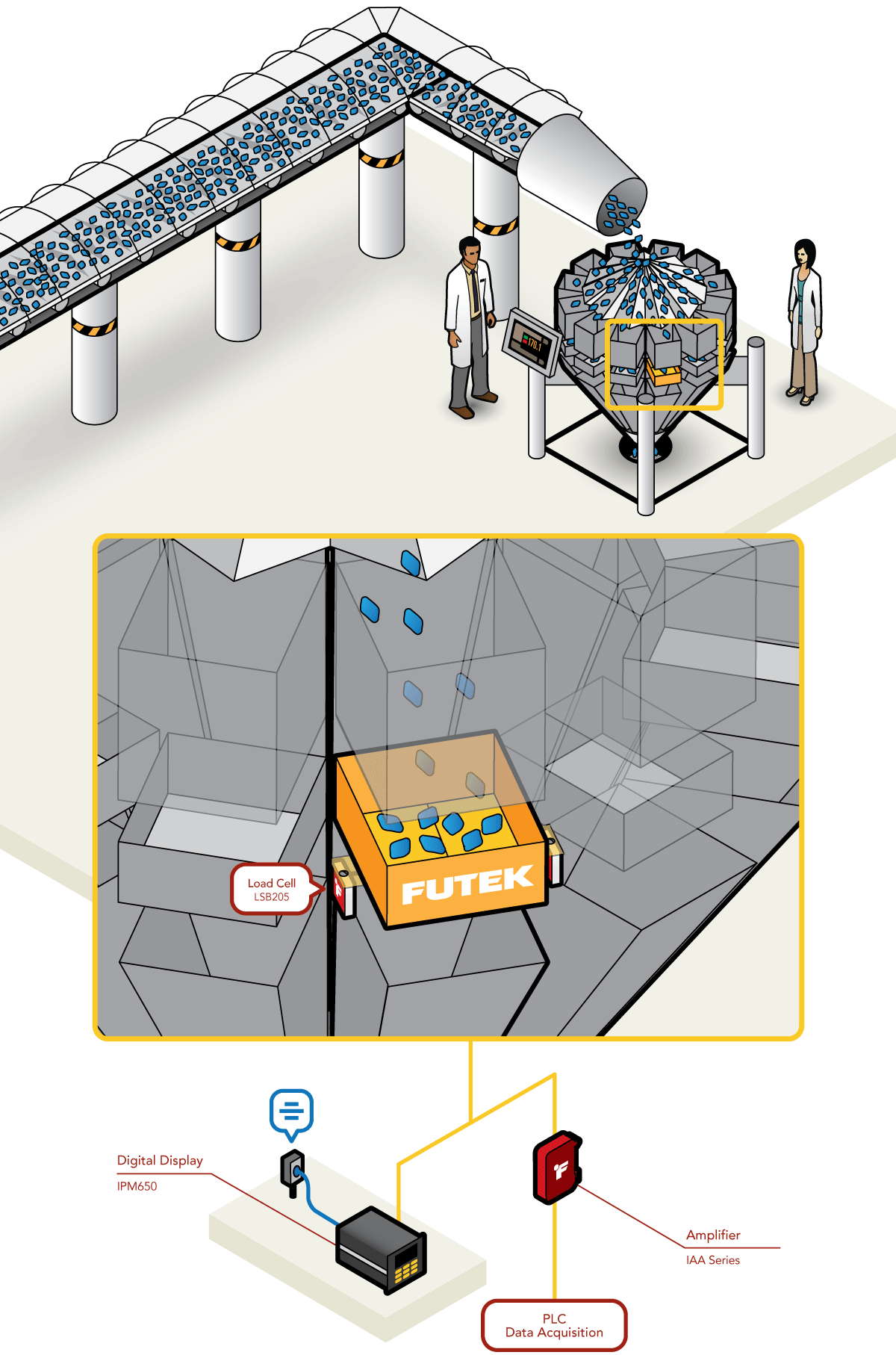 3、在該應用中,每個分配器上安裝兩只FUTEK LSB200微型力傳感器,LSB200(帶10倍于量程的過載保護)稱量分配器中產品的數量。