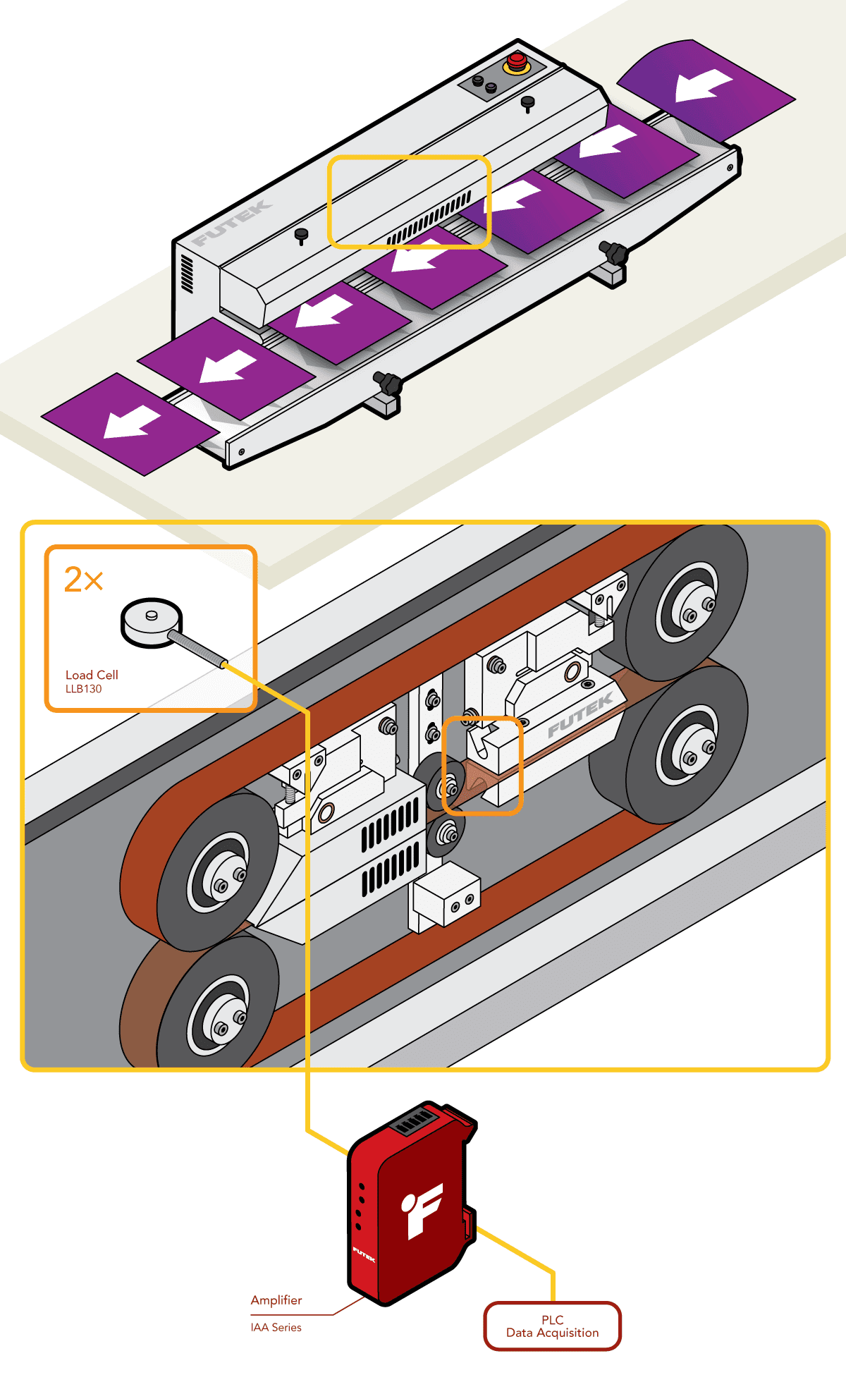 FUTEK超小型按鈕測力傳感器(LLB系列),搭配IAA系列模擬放大器與PLC進行通訊。