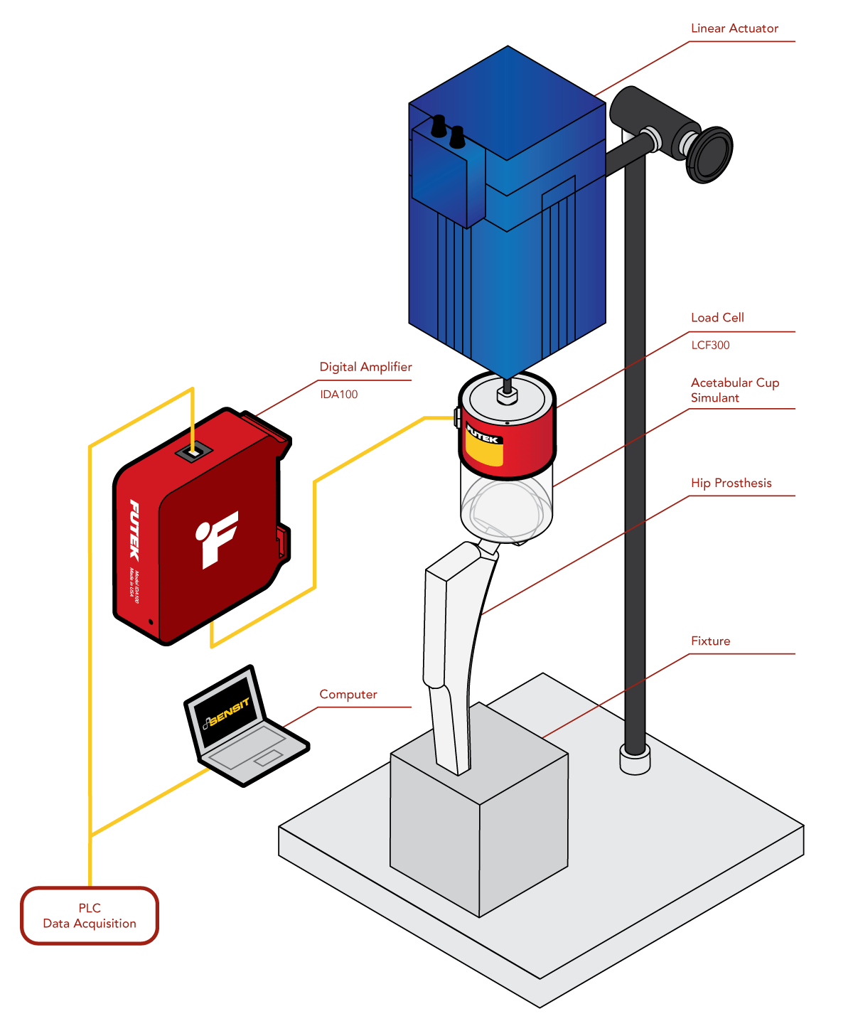 2、然后在髖臼杯和線性致動(dòng)器之間安裝一個(gè) LCF300 輪輻式拉壓力傳感器,用于測(cè)試期間的力測(cè)量。