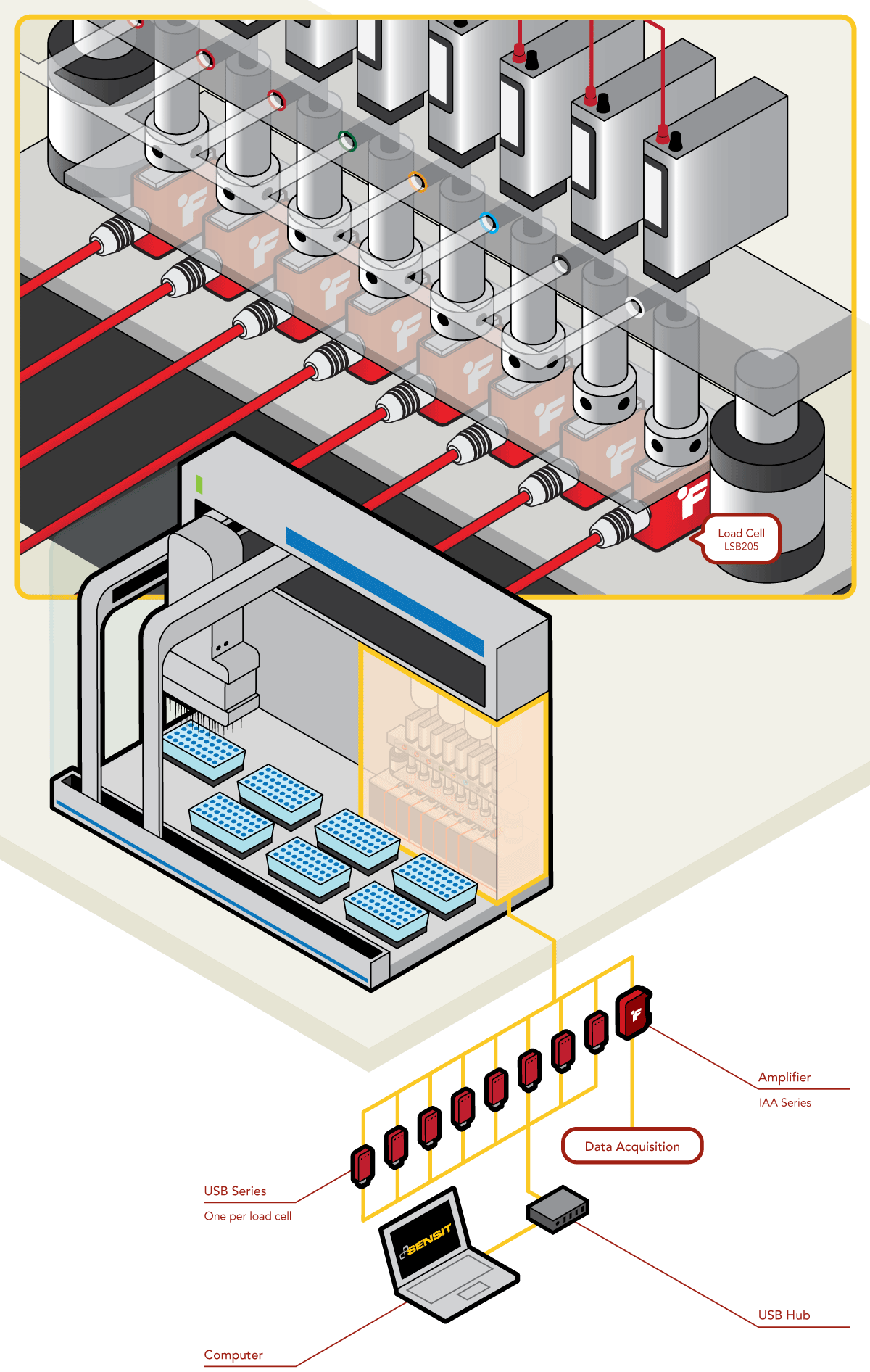 1、在該應(yīng)用當(dāng)中,必須要精確保證合成DNA每一種配劑的數(shù)量一致。在每一種配劑容器底部,都安裝有FUTEK的LSB200 S型測(cè)力傳感器,來監(jiān)測(cè)容器重量的變化。