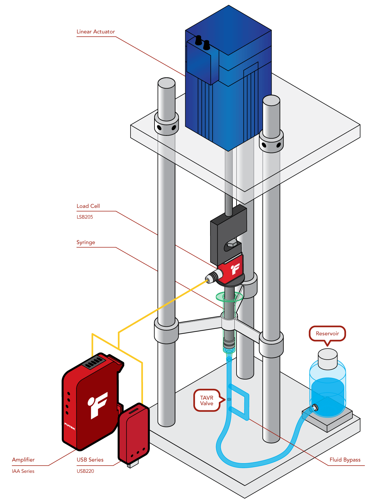 1、LSB 系列力傳感器與線性致動器和注射活塞相連接,用于測量注射活塞的壓力,以進行測試驗證。